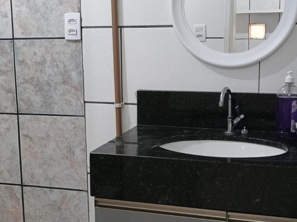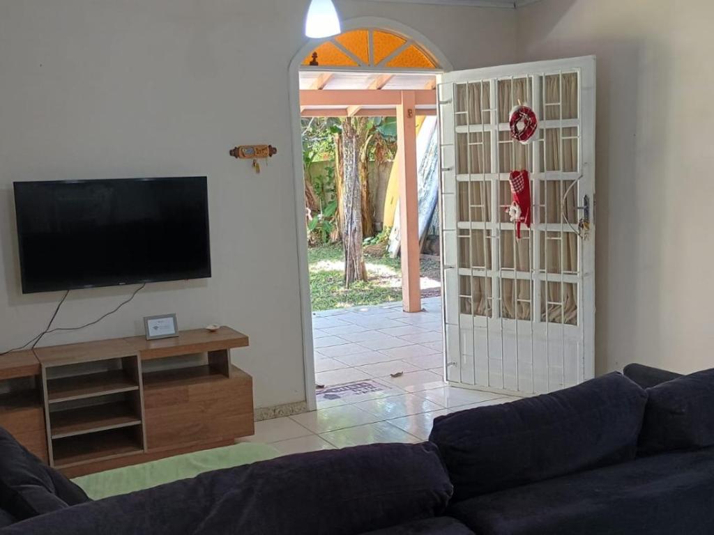 No térreo, esta casa de temporada possui 1 quarto, uma cozinha bem equipada com geladeira, uma sala de estar, e uma TV de tela plana.